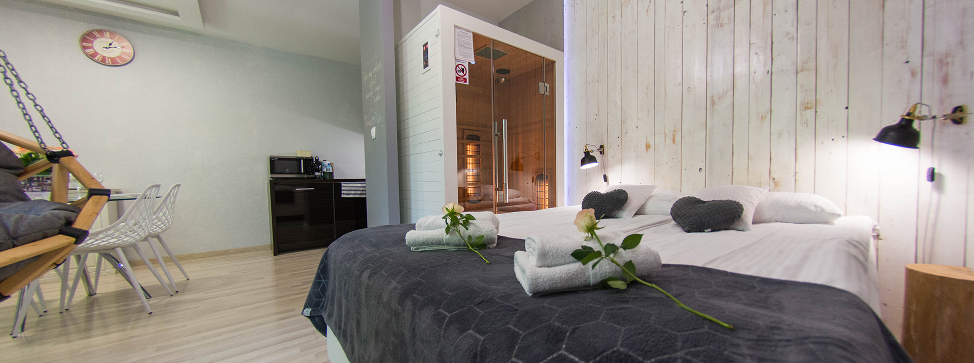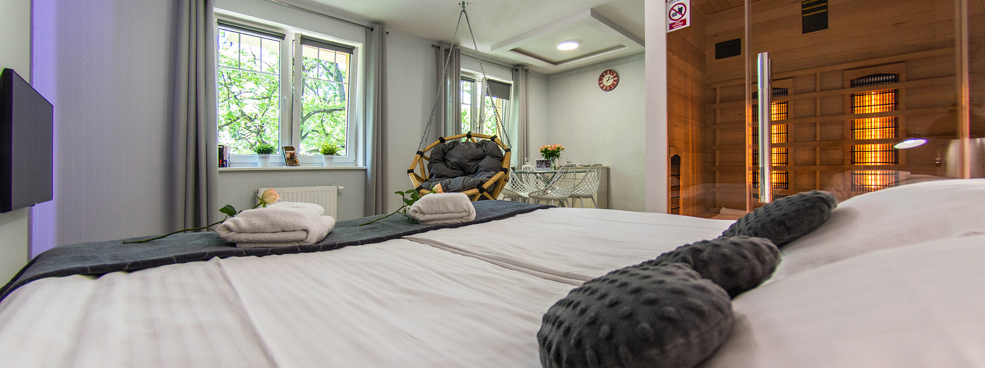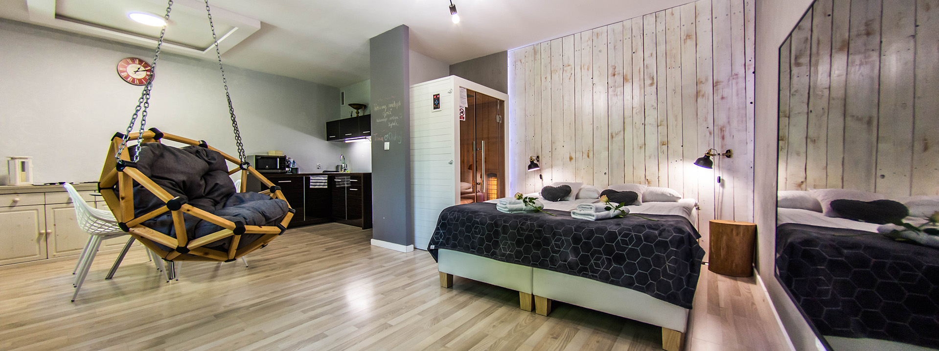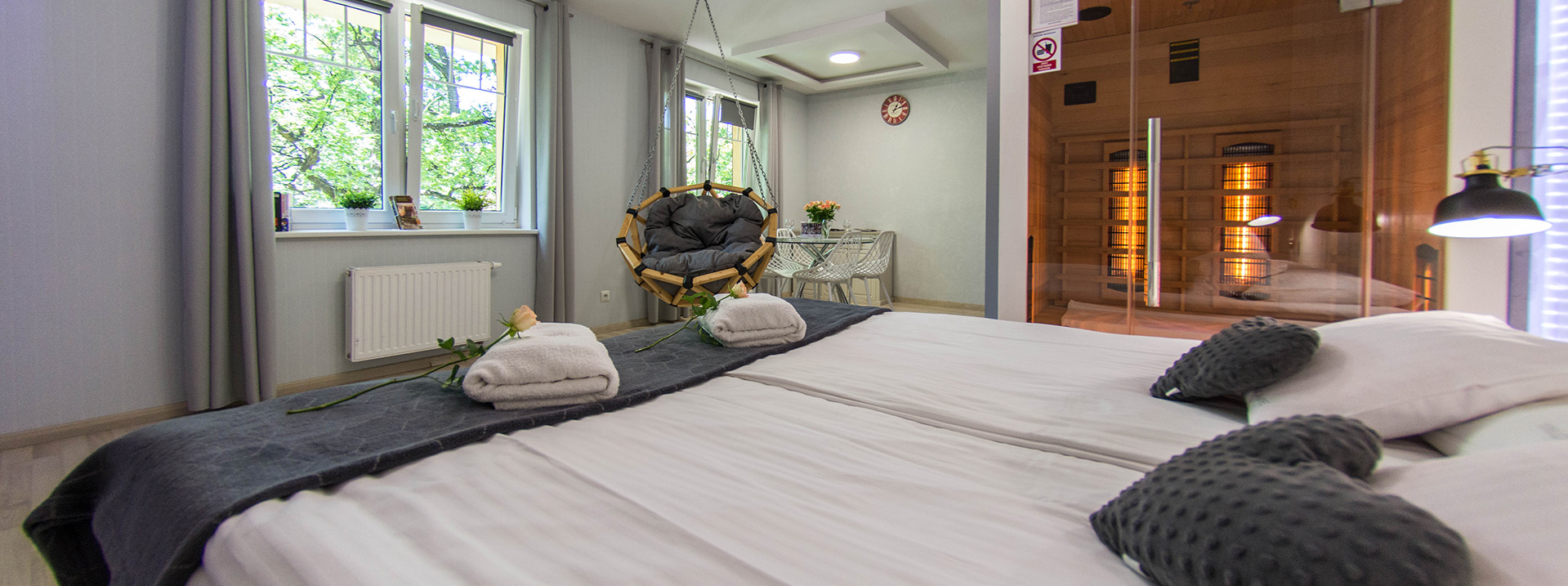 Apartament składa się z salonu, połączonego z aneksem kuchennym oraz łazienki wyposażonej w prysznic. W apartamencie znajdują się: sauna do indywidualnego korzystania przez gości – korzystanie wliczone w cenę, wygodne łóżko dwuosobowe (z możliwością rozdzielenia), stół i cztery krzesła, stolik kawowy, fotel bujany oraz SMART TV. W przypadku rezerwacji noclegu w Karpaczu dla 3 osób w apartamencie koraLOVE z sauną udostępniamy dodatkowe łóżko (dostawka).