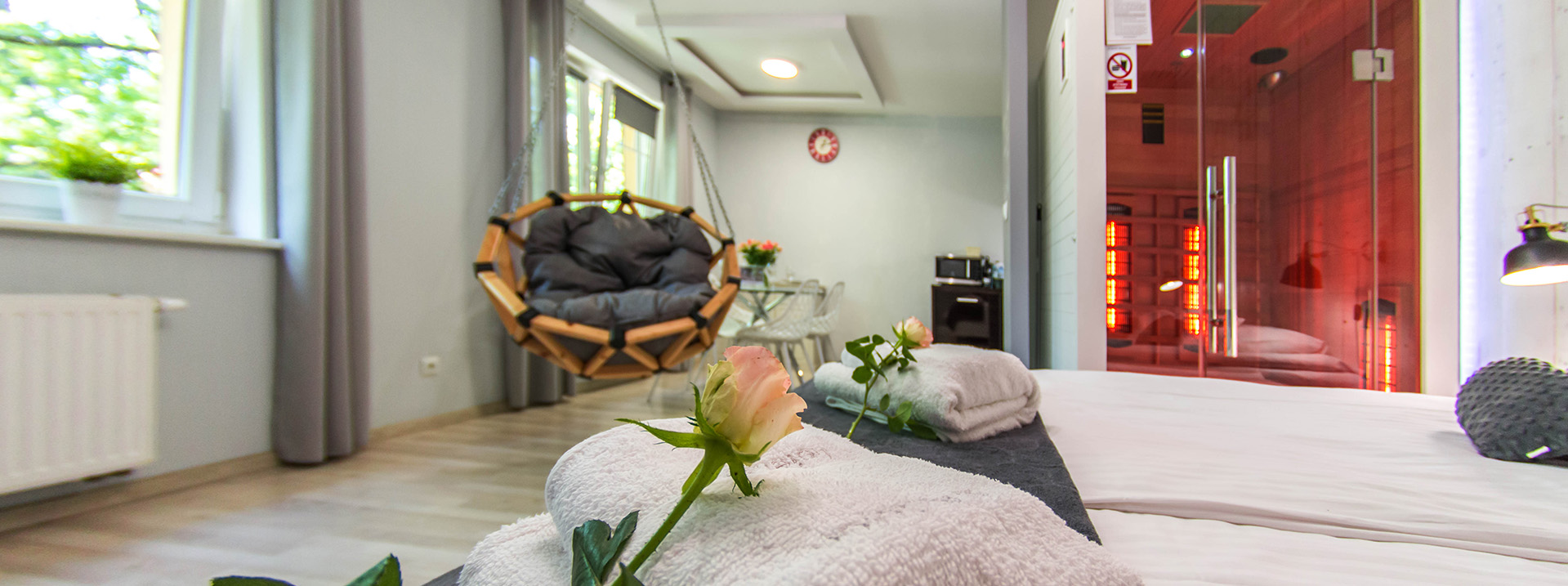 Apartament koraLOVE z sauną to romantyczny apartament typu studio, o powierzchni 33 m2, który został oddany do użytku w 2013 r. Jest położony na II piętrze budynku, przeznaczony dla 2 lub 3 osób. We wrześniu 2025 r. apartament przeszedł odświeżenie i metamorfozę po to aby naszym gościom było wygodniej wypoczywać. Wymieniliśmy materace, zmieniliśmy aranżację salonu, dodaliśmy oświetlenie ledowe. Ten cichy i wygodny apartament na wynajem w Karpaczu został zaprojektowany tak, by sprostać oczekiwaniom nawet najbardziej wymagających gości. Jasne wnętrza powodują, że lokal jest przestronny, co przekłada się na komfort wypoczynku. Dodatkowym atutem jest bezpłatny dostęp do bezprzewodowego Internetu.